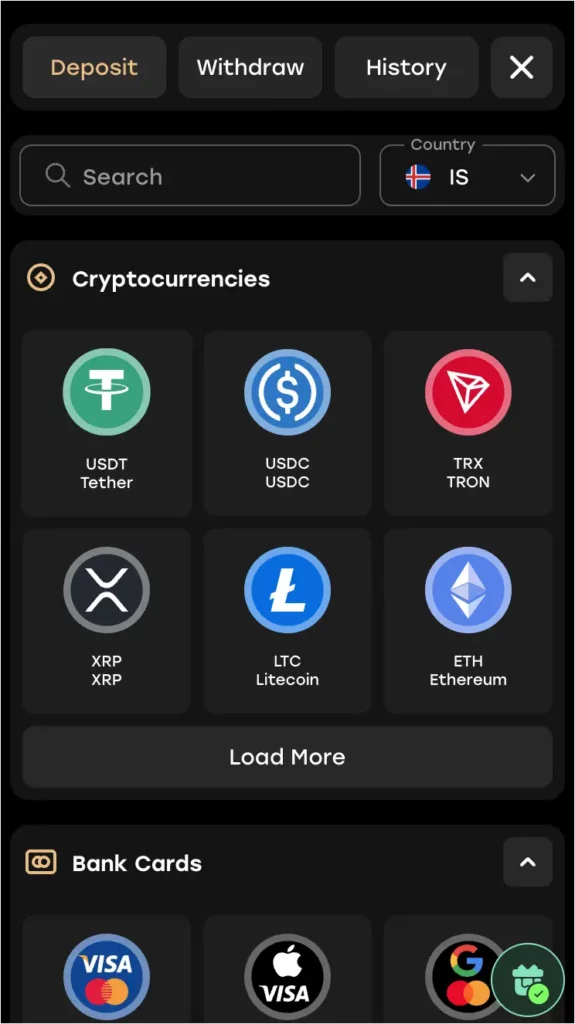 Looking at Fairspin’s cashier, you’ve got a pretty solid spread of payment options to work with. Crypto dominates the lineup – USDT, Bitcoin, Ethereum, Litecoin, XRP, and several others are all there, with a “Load More” button suggesting even more options beyond what’s immediately visible. For traditional methods, there’s Visa and Google Pay under bank cards, plus Revolut and instant bank transfers if you prefer internet banking.